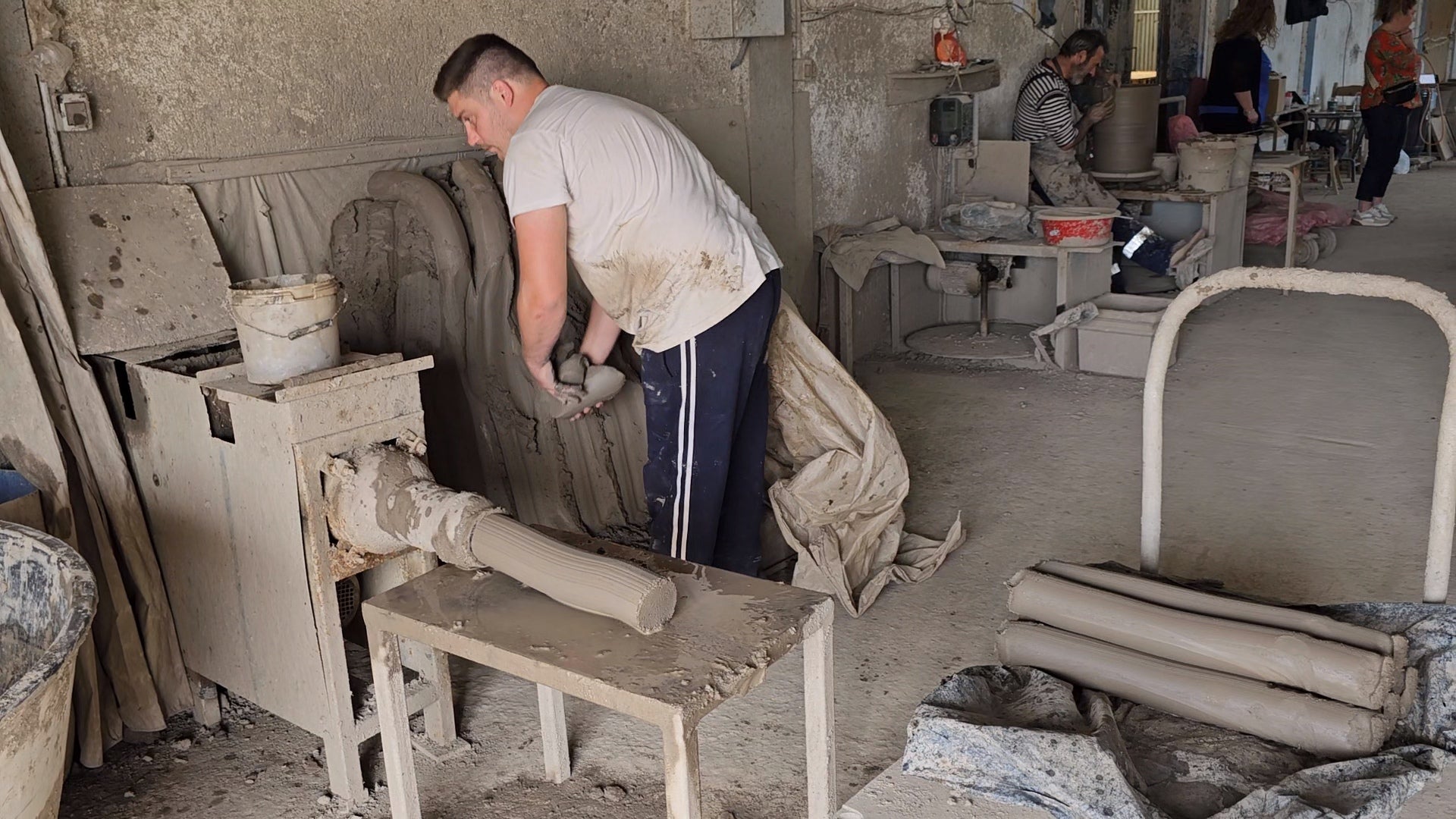 The prepared clay is then formed into cylinders which the potter begins to shape on a potter’s wheel. Often, to achieve perfection, the wheel is still turned by hand as can be seen in our videos.